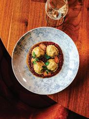 favorites, currently. What makes ours di erent … since we are veggie-forward and that’s what everybody’s come to expect from us, ours is not meat. So, we take kohlrabi, we slow cook it with miso and brown butter and let that go for 12 hours, then come back and compress it to let the vegetables set back up. A er that, we let it sit overnight, then come back in and slice it paper-thin on the slicer. So you get that initial texture that you would get from esh. But there’s a little bit of bite, to the point where you almost identify it as not meat, but it’s very interesting. We top that with a little lemon zest, Maldon [sea salt], smoked walnuts, and then basil oil around the side.”