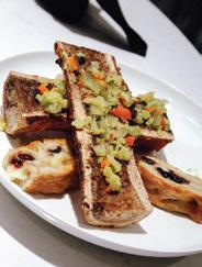 “ e new mu uletta roasted bone marrow at Iris is a fun little appetizer. All of the avor pro le elements of a traditional mu uletta exist with salami spice on the marrow, giardiniera on top, and fresh olive and provolone focaccia to eat it with.”
