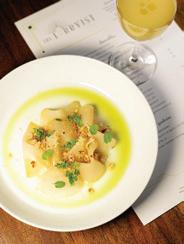 “Item number two: Bone marrow ravioli, tomato sauce, brown butter, toasted garlic. I really enjoy making this pasta. Bone marrow is brined, lightly cooked, and removed from the bone. en we combine it with ground short rib, caramelized onions, toasted breadcrumbs, and some fresh herbs. We make a dark tomato sauce, which gets nished with brown butter that has garlic toasted to order. e end result of the sauce is something like a butter chicken curry sauce, only garlicky.”