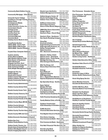Community Bank DeSoto County 662.349.4200 Community Mortgage - Olive Branch 662.349.1300 Concorde Career College 662.429.9909 Confidence Through Training (Firearms Safety Class) 901.314.1238 Contemporary Media 901.521.9000 Cook Electrical 662.253.8362 Cooke Insurance Center, Inc. 662.429.4488 Cornerstone Church 662.349.0216 Cottage Creek 901.568.3720 Cougar Chemical 901.362.8373 Country Ford, Inc. 662.349.4300 Country Skillet 662.280.2060 Courtyard-Marriott 662.996.1480 Covenant Bank 662.536.2016 Cowboy Corner Boots & Jeans 662.890.3380 CrossPointe Studios 901.361.7661 CRYE-LEIKE - Annice Kyle 901.486.0748 CRYE-LEIKE of Mississippi 662.349.5550 CRYE-LEIKE - Donnie Chambliss 901.355.2074 Crystal Clear Computer Solutions 901.209.2227 Custom Jewelry 662.349.9070 D'Vine Wines & Spirits 662.536.2940 DAC (DeSoto Athletic Club) 662.349.0403 Dairy Queen of Southaven 662.470.4869 Dale's Restaurant 662.393.2060 Delgado Law Firm, PLLC 662.536.2120 Delta Gastroenterology, P.C. 662.280.8222 Delta Technical College 662.280.1443 Delta Weight Management Center 662.548.8075 Designs by Teri, Inc. 901.848.3814 DeSoto Appeal 901.529.6471 Desoto Arts Council 662.404.5458 DeSoto Central High School 662.536.3612 DeSoto Collision Center 662.349.9441 Desoto Community Health Center 662.349.6220 Desoto County Administration 662.469.8000 DeSoto County Animal Clinic 662.342.4899 Desoto County Career Tech - West 662.393.6211 DeSoto County Chancery Clerk 662.429.1318 Desoto County Chiropractic 662.393.4848 Desoto County Friends of the NRA 901.490.2945 DeSoto County Maps (MI-DA Maps) 662.429.0022 DeSoto County Schools 662.429.5271 Desoto County Sheriff's Department 662.469.8534 DeSoto County Tourism Association 662.393.8770 Desoto County WIN Job Center 662.342.4002 DeSoto Economic Development Council 662.429.4414 DeSoto Eye Care 662.349.1959 DeSoto Family Medical Center 662.393.7722 DeSoto Family Theatre, Inc. 662.280.6546 Desoto Guns & Gunsmithing 662.253.8097 DeSoto Hills Baptist Church 662.890.2452 Desoto Imaging Specialists 662.349.4321