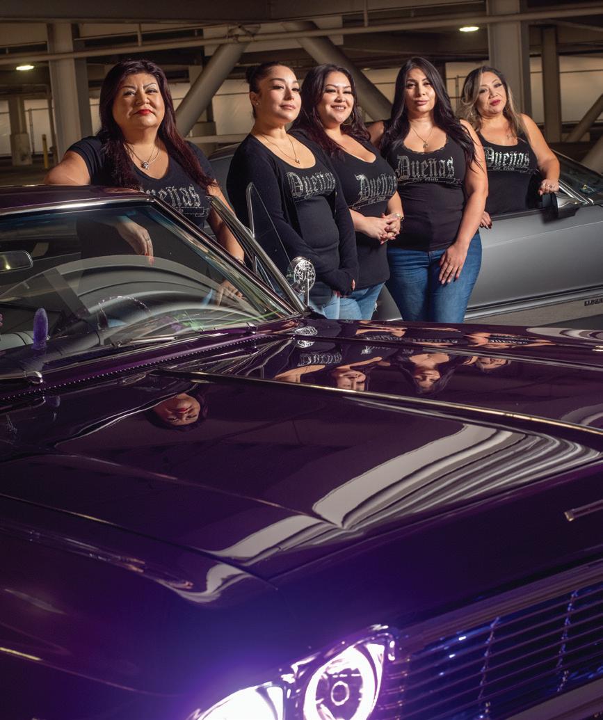 between years of solo riding, Angel helped build the United Lowrider Council of San Jose. Her vision of community service work built the foundation for Dueñas. The all-woman’s fleet works with local organizations to hold toy drives, fundraisers, and safety kits—pulling up in outfits that match their cars. C