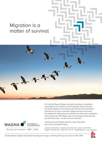 For the last 50 years Magna has been providing a competitive advantage for its customers in the broadcast industry through the timely adoption of innovations with minimal risk of disruption. Summed up as secure innovation, Magna de-risk a first-mover advantage and safely takes its customers to where their competitors haven’t gone yet. With Magna, you can rest assured that we’ll get you there securely – we owe it to our reputation. Contact your local Magna office for more information and a free consultation today. Auckland +64 9520 1582 Hong Kong +852 2563 4453 Jakarta +62 8181 43923 Singapore +65 6282 3613 Sydney +61 2 9417 1111 sales@magnasys.tv www.magnasys.tv