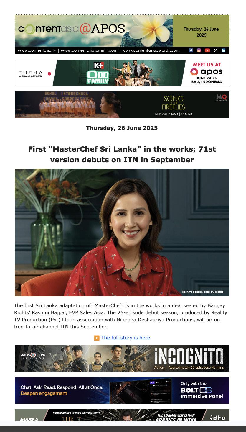 To receive your regular free copy of ContentAsia, please email contentasia@contentasia.tv