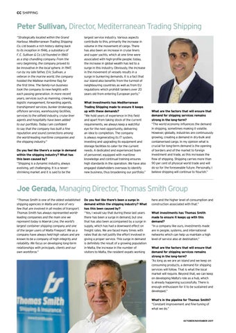 Peter Sullivan, Director, Mediterranean Trading Shipping “Strategically located within the Grand Harbour, Mediterranean Trading Shipping Co. Ltd boasts a rich history dating back to its inception in 1946, a subsidiary of F. E. Sullivan & Co Ltd founded in 1860 as a ship chandling company. From the very beginning, the company proved to be innovative in the local sphere. In 1947, run by my late father, Eric Sullivan, a veteran in the marine world, the company hoisted the Maltese maritime flag for the first time. The family-run business took the company to new heights with each passing generation. In more recent years, services such as manning, crewing, logistic management, forwarding agents, transhipment services, bunker brokerage, offshore services, warehousing facilities, services to the oilfield industry, cruise liner agents and hospitality have been added to our portfolio. Today I am confident to say that the company has built a fine reputation and sound connections among the world-leading maritime companies and the shipping industry.” Do you feel like there’s a surge in demand within the shipping industry? What has this been caused by? “Shipping is a dynamic industry, always evolving, yet challenging. It is a nevershrinking market and it is said to be the