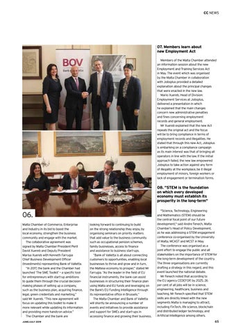 06. Malta Chamber of Commerce, Enterprise and Industry in its bid to boost the local economy, strengthen the business community and engage with the market. The collaborative agreement was signed by Malta Chamber President Perit David Xuereb and Deputy President Marisa Xuereb with Kenneth Farrugia Chief Business Development Officer (Investments) representing Bank of Valletta. “In 2017, the bank and the Chamber had launched ‘The SME Toolkit’ – a specific tool for entrepreneurs with start-up ambitions to guide them through the crucial decisionmaking phases of setting up a company, such as the business plan, acquiring finance, legal, green credentials and marketing,” said Mr Xuereb. “This new agreement will focus on updating this toolkit to make it more relevant while updating its information and providing more hands-on advice.” The Chamber and the bank are JUNE/JULY 2019