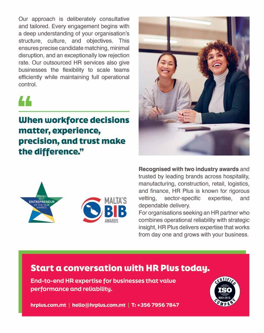 As usual, this edition also features our Upfront section, highlighting timely issues and developments shaping leadership across sectors, alongside 50 carefully curated interviews with some of Malta’s sharpest business minds. Together, they remind us that for those willing to embrace change and find opportunity within uncertainty, the future remains as challenging as it is full of promise.