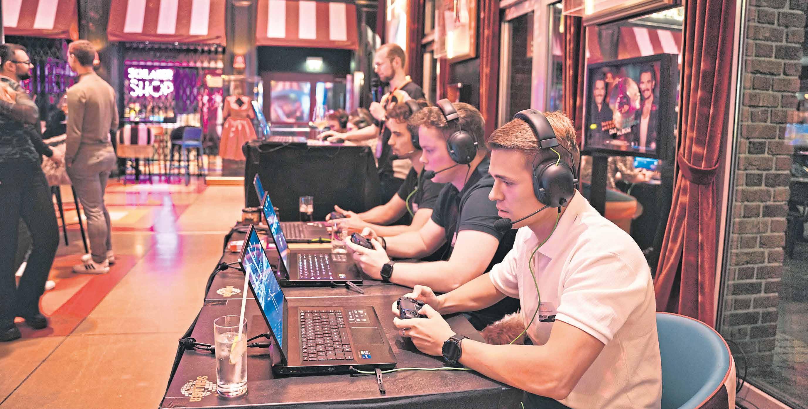 er Wegweiser führt in den vierten Stock. Oben, wo die Rolltreppe leise ihre Stufen schluckt, wird es plötzlich dämmrig wie in einer Kirche. Hier stehen in langen Reihen Computer mit rückenfreundlichen Sesseln, auf denen meist junge Leute sitzen und ihr Lieblings-Game spielen. Jubel oder Verwünschungen, je nachdem, wie’s läuft. Ein Dorado für Zocker, wo jeder rein darf, ohne Eintritt, ohne Zeitlimit, geteilt nach Alter „ab 12“ und „ab 18“. Security-Leute passen auf, lassen sich im Zweifel den Ausweis zeigen und fragen schon mal nach, wenn 13-Jährige während der Schulzeit zum Zocken kommen. Es gibt eine Event-Bühne, TV-Equipment für Video-Drehs, sogar eine Bar. Und natürlich kann man hier auch alle Spiele kaufen, die man ausprobiert hat.