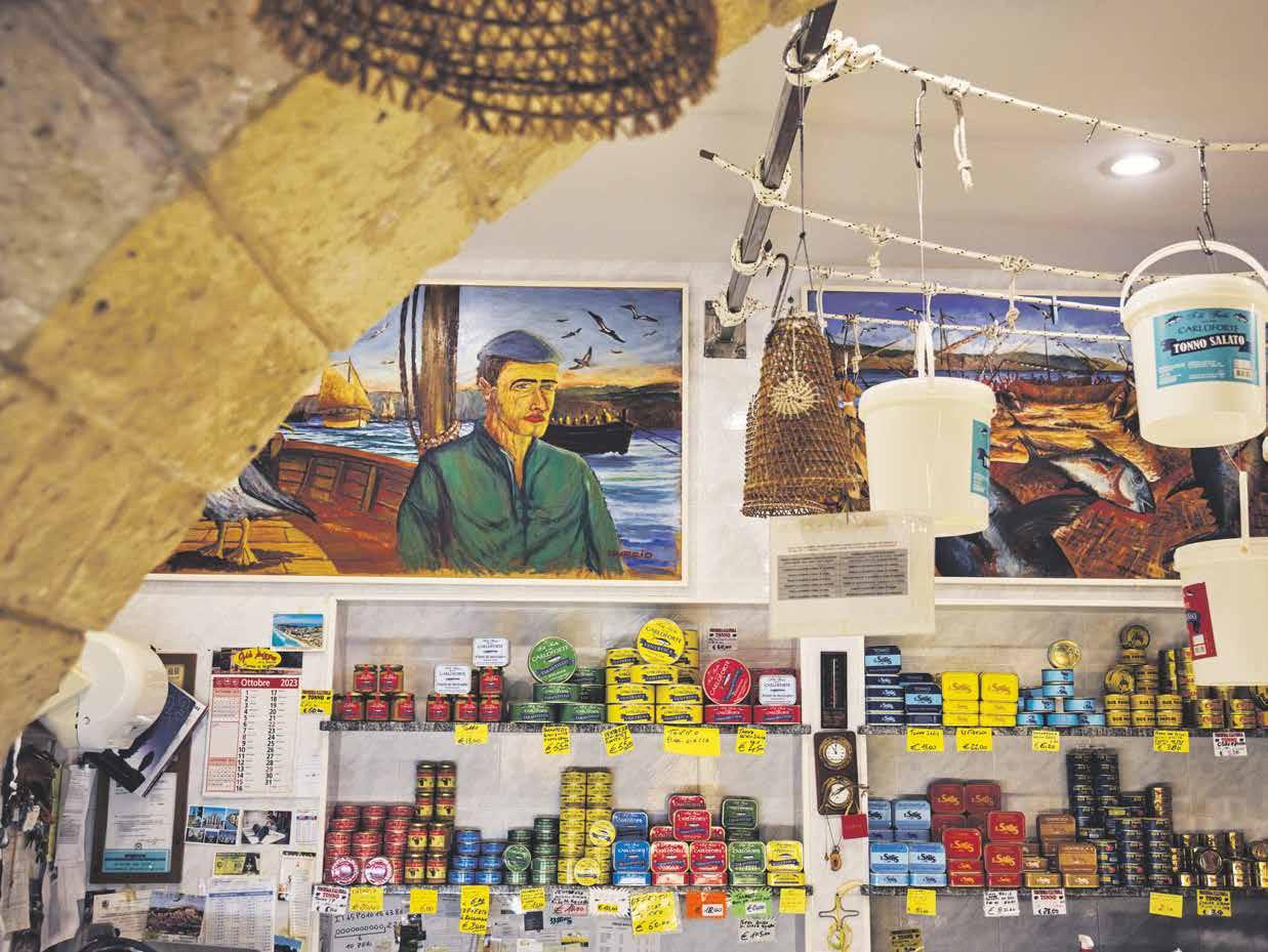 Der Tonno rosso ist auf die Treppen gemalt, er schwimmt an den Wänden, unter den Decken. Geschnitzt aus Holz, geformt aus dem Kork alter Bojen. In den Bars haben sie die Planken gesunkener Fischerboote an die Wände genagelt. In die Pflastersteine, die zur Kirche San Carlo Borromeo führen, sind die Muster von Fischen eingelassen. Und die bunten Kleidchen in den Boutiquen hängen an den Spieren ausgedienter Ruderboote.
