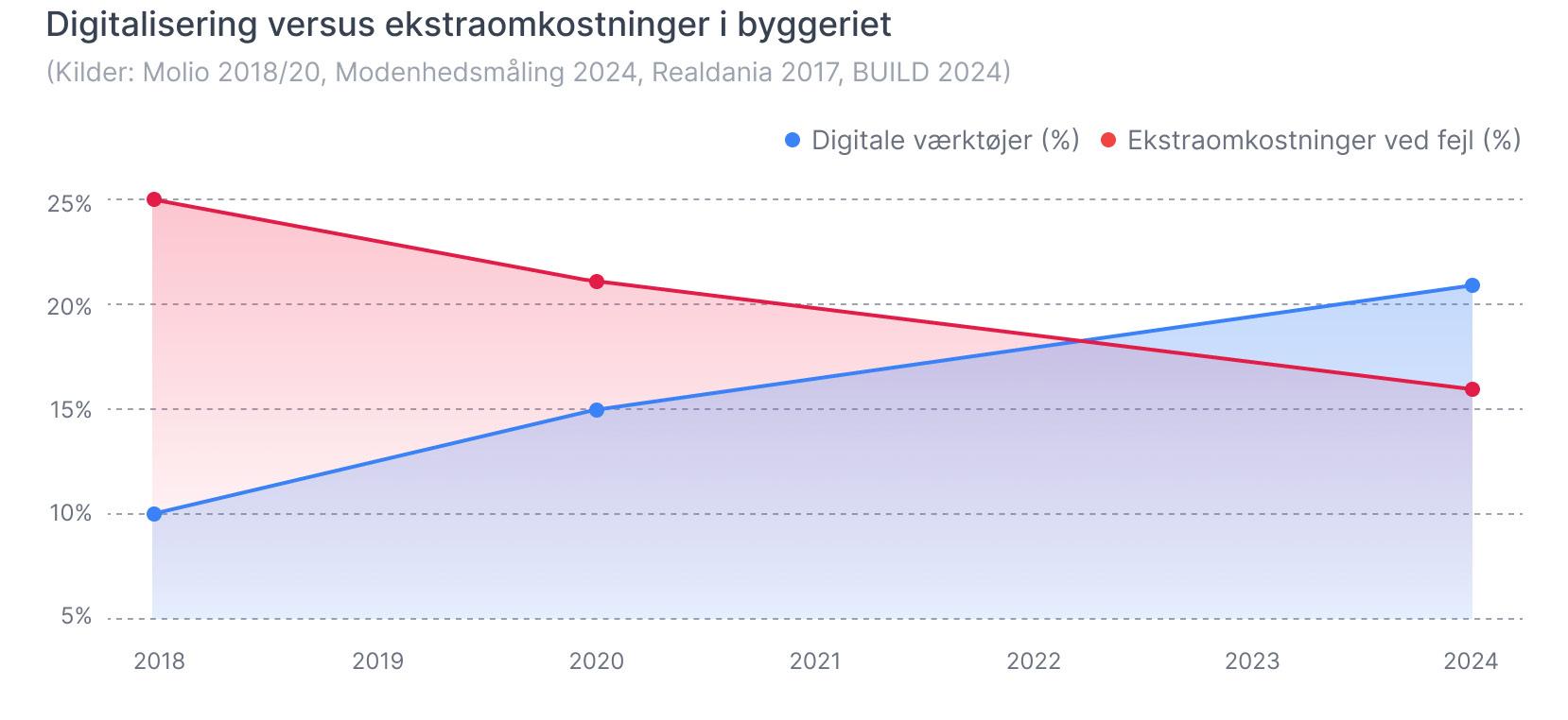 5. Fejl, svigt og ekstraregninger Fejl og svigt, der opdages for sent, er en væsentlig kilde til ekstraudgifter både under udførelse og i drift. En BUILD-undersøgelse fra 2024 viser, at fejl, spild og manglende koordinering i danske byggeprojekter kan koste mellem ti og tredive procent af den samlede projektomsætning, mens en Realdania-støttet brancheanalyse fra 2023 anslår de årlige fejlomkostninger til omkring tolv milliarder kroner.