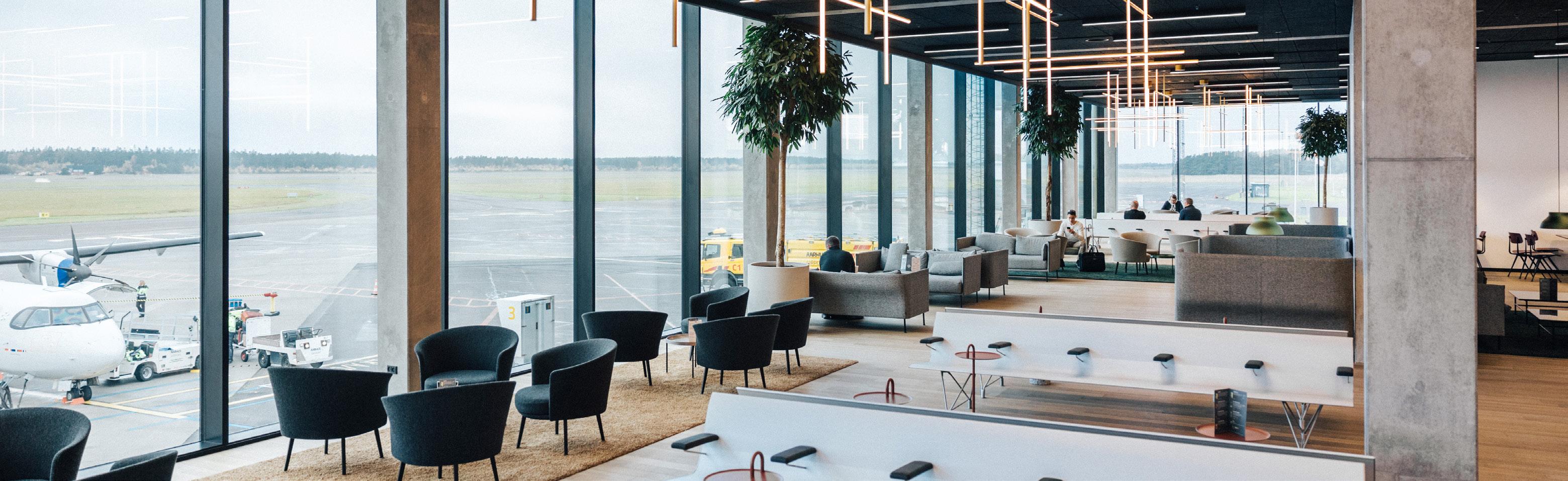 Med udsigt til landingsbanerne og et varieret udvalg af møbler er rummet designet til både ro og inspiration – hvad enten man vil arbejde, læse eller blot nyde en god kop kaffe før afgang.