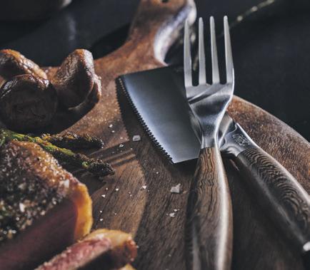 ”Sættet er smukt og unikt, og knivbladet ligner en lille tomahawk. I stedet for den klassiske trekantede form er takkerne runde, og det betyder, at kniven skærer kødet som smør,” forklarer Kristoffer Glerup.