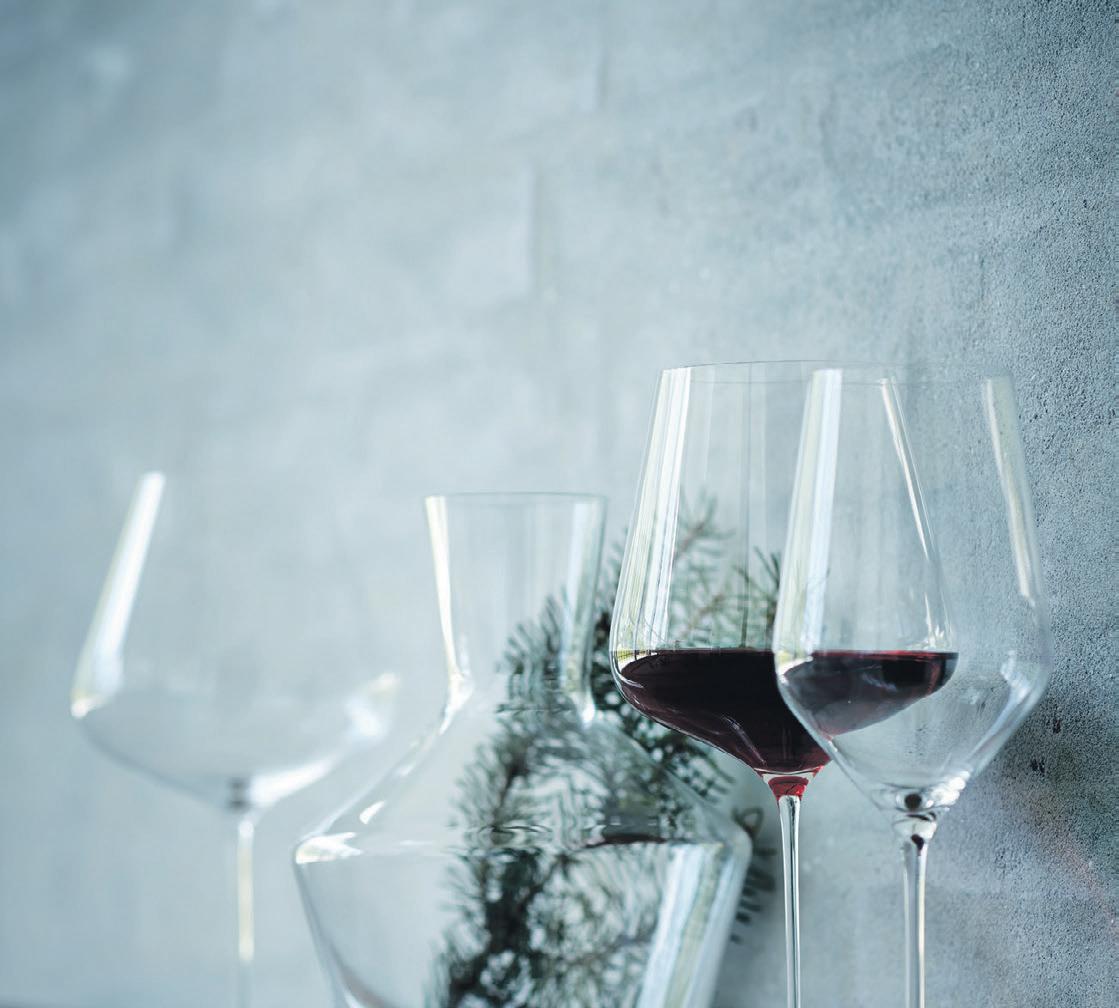 I bunden af vinglassene er udformet en fordybning, som visuelt fremhæver nuancerne i vinen. Et læderetui til bestikket giver et ekstra touch ved borddækningen. Champagnesablen fås med en personlig gravering og en tilhørende holder i eksklusivt wengé-træ. Og skærebrættet er produceret i amerikansk valnød og har et særligt design, der giver smukke skygger over bordet.