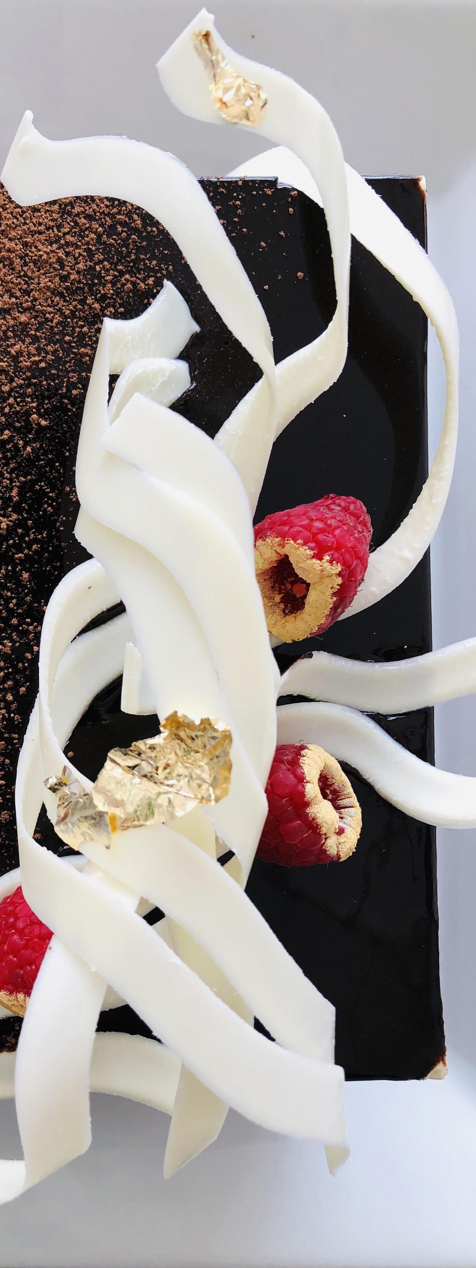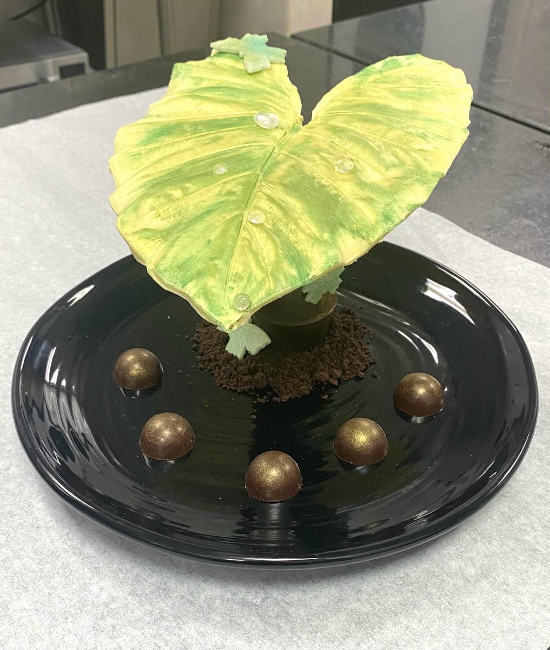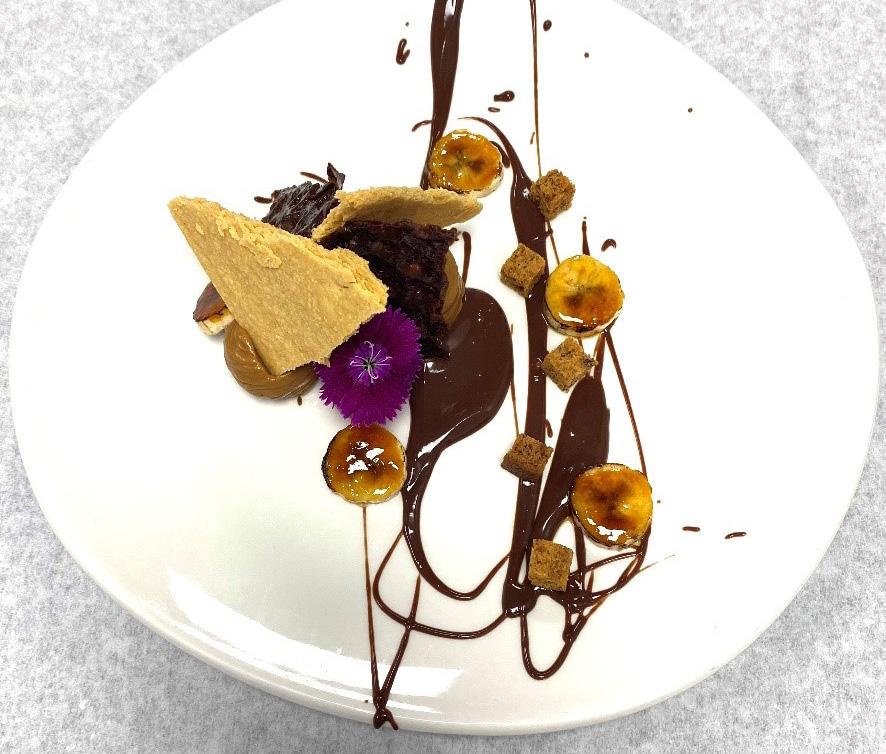*DESCONSTRUCCIÓN DE TARTA DE PLÁTANO AL RON ESPECIADA, NIBS DE CACAO Y HELADO DE COCO *