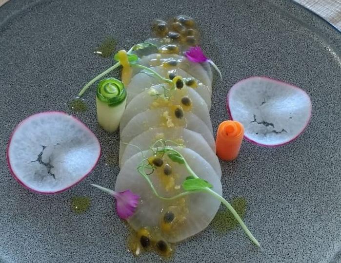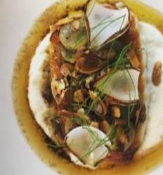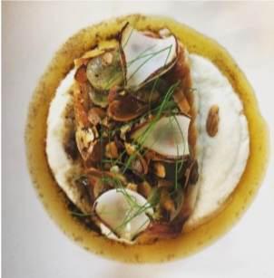 3.- Avellanamos la mantequilla una vez lista enfriamos un poco y agregamos la almendra tostada, las alcaparras y reservamos Lobina. En un sartén sellamos por la parte de la piel y terminamos cocción con mantequilla. Emplatado calentamos subise, ponemos al centro del plato, arriba la lobina y coronamos con el gastric antes de poner el gastric, le agregamos