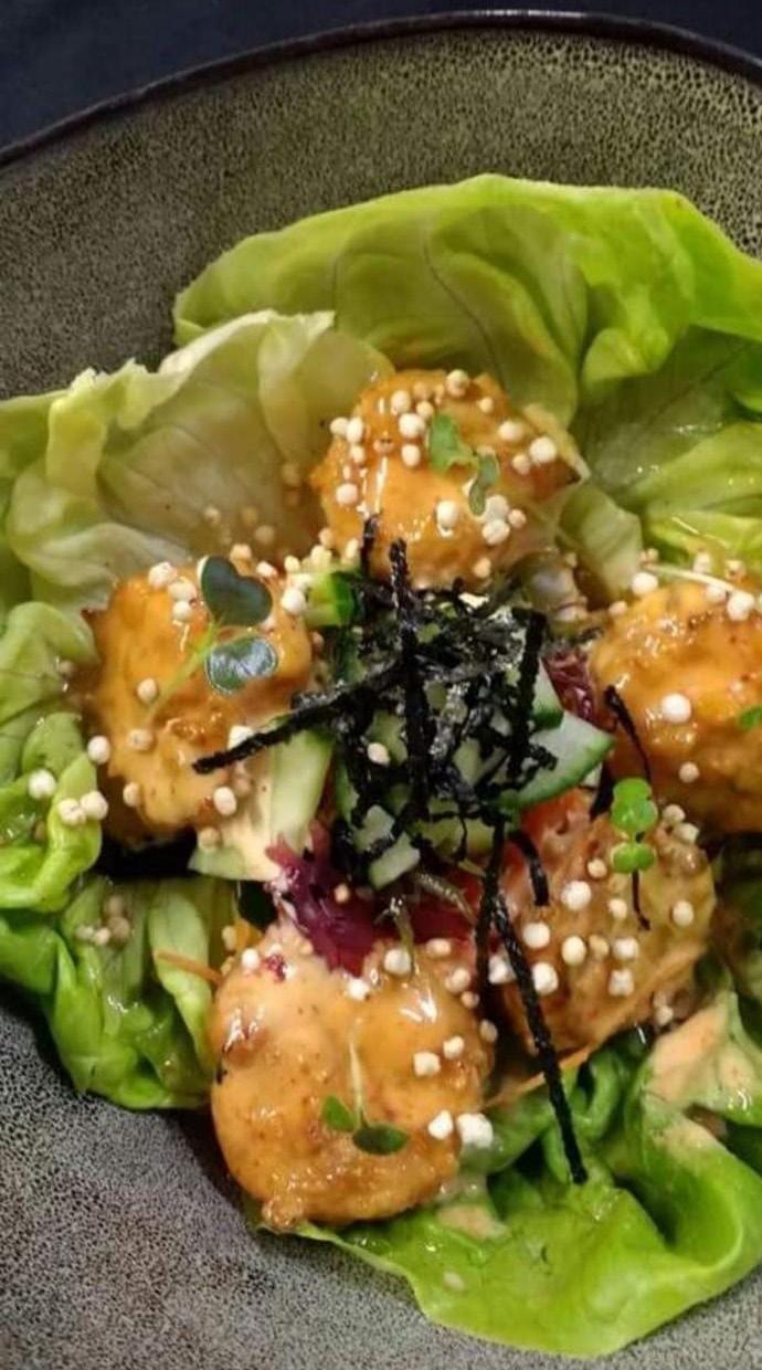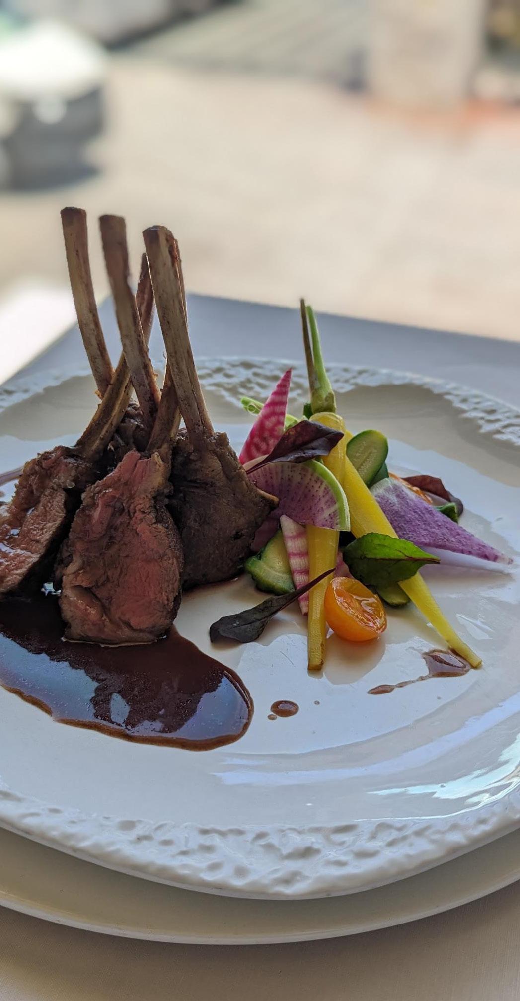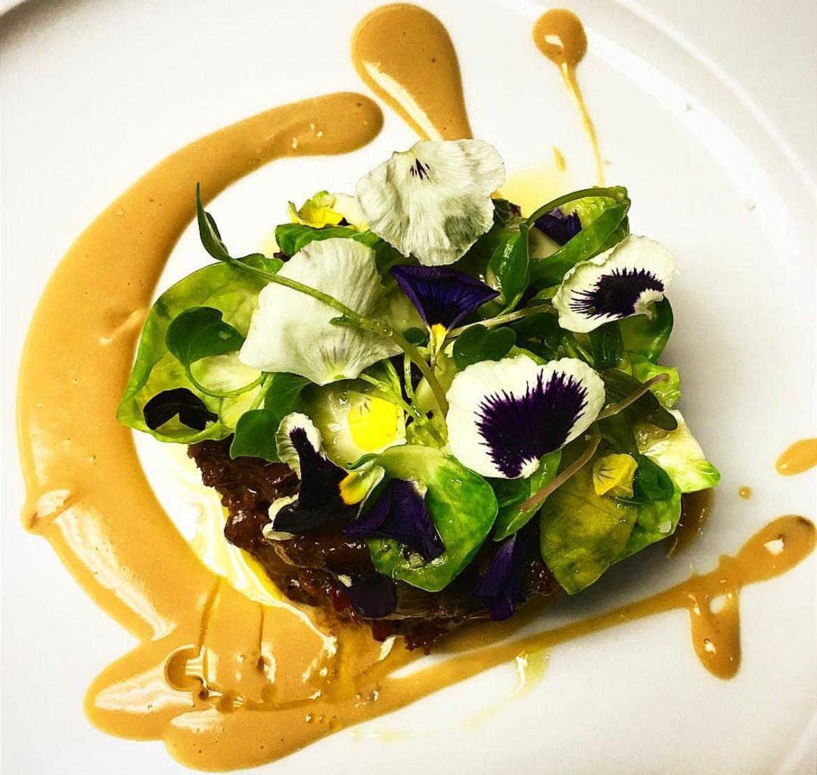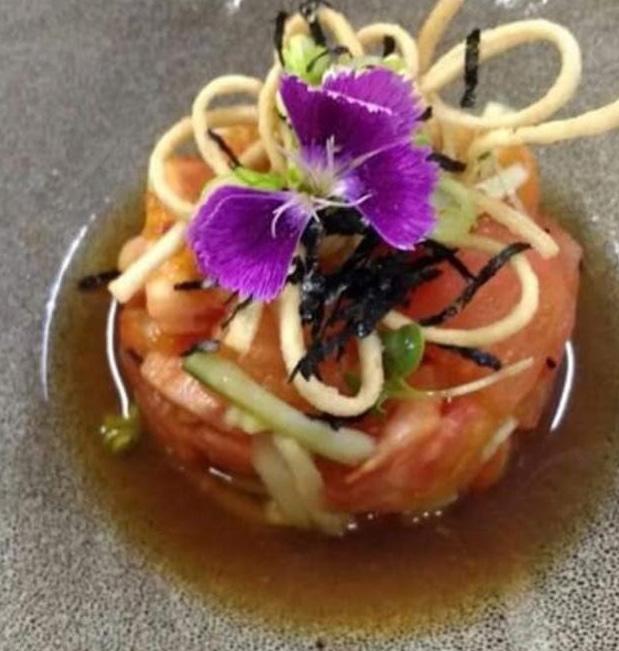 hasta alcanzar terminó medio de cocción, (63 grados internos) ya quita el sartén y elaborar la salsa con aceite de oliva, cebolla y ajo picado, chile serrano (c/n) y alcaparras (c/n), sofreír hasta acitronar agregar después vino tinto (c/n) y que reduzca a la mitad, después agregar salsa de soya, cilantro, tomillo miel de abeja y salpimentar al gusto y ligar con mantequilla, te darás cuentas que tu salsa estará lista cuando la notes espesa y brillante, para terminar cortar pequeños tozos de coliflor meterlos a freír hasta que queden doradas y suaves por dentro, poner aceite de trufa blanca y espolvorear queso Cotija, poner en contraste con los pedazos de filetes cortados en tamaño de 2 cm y terminar el platillo con hojas de cilantro frescas para decorar y cubos de aguacate con orégano.