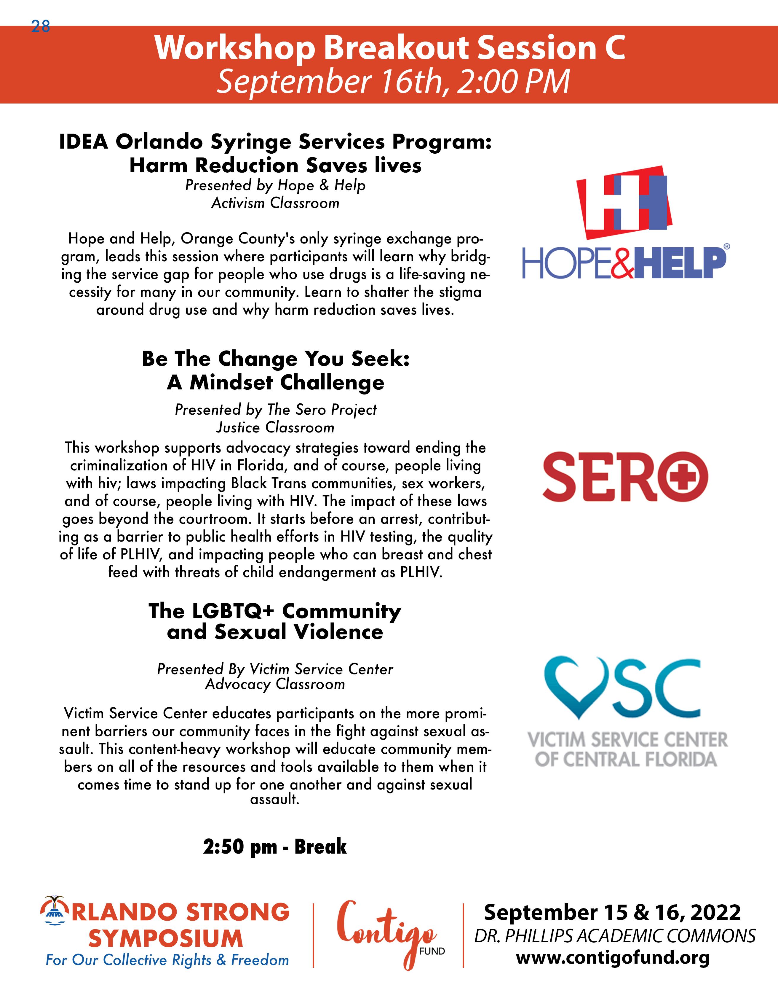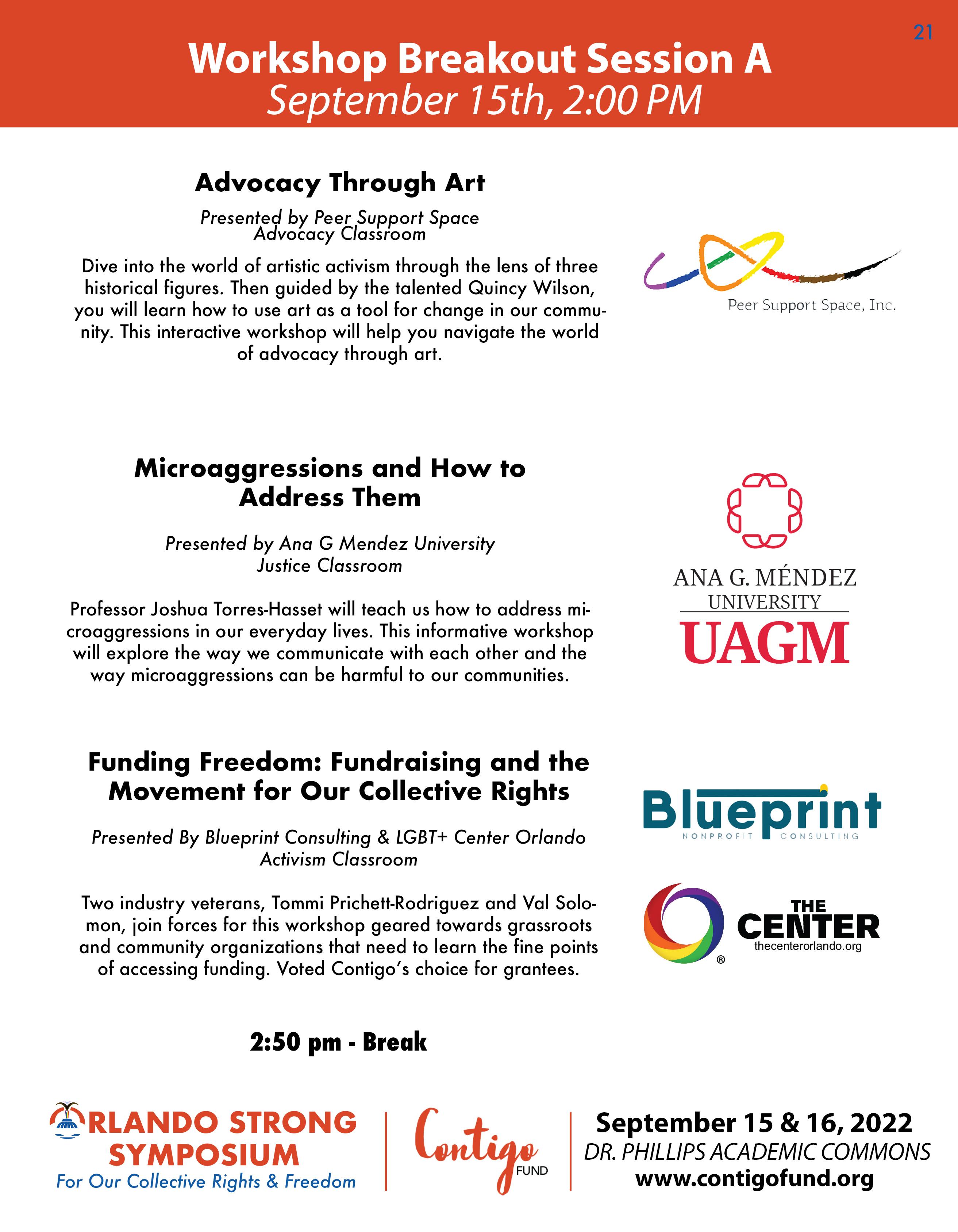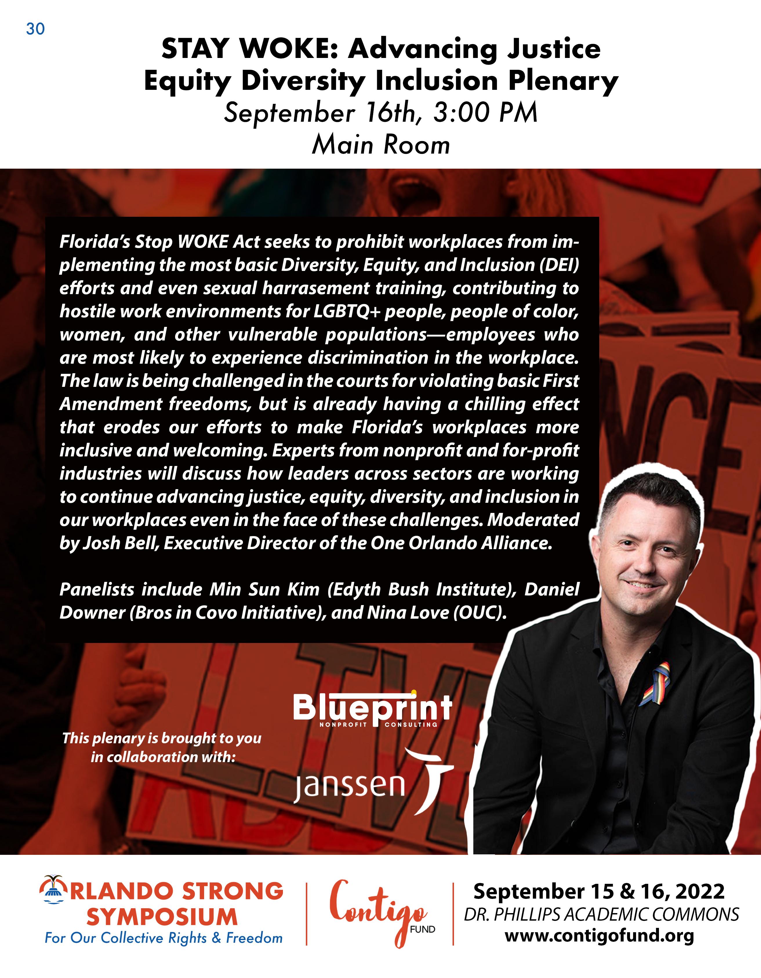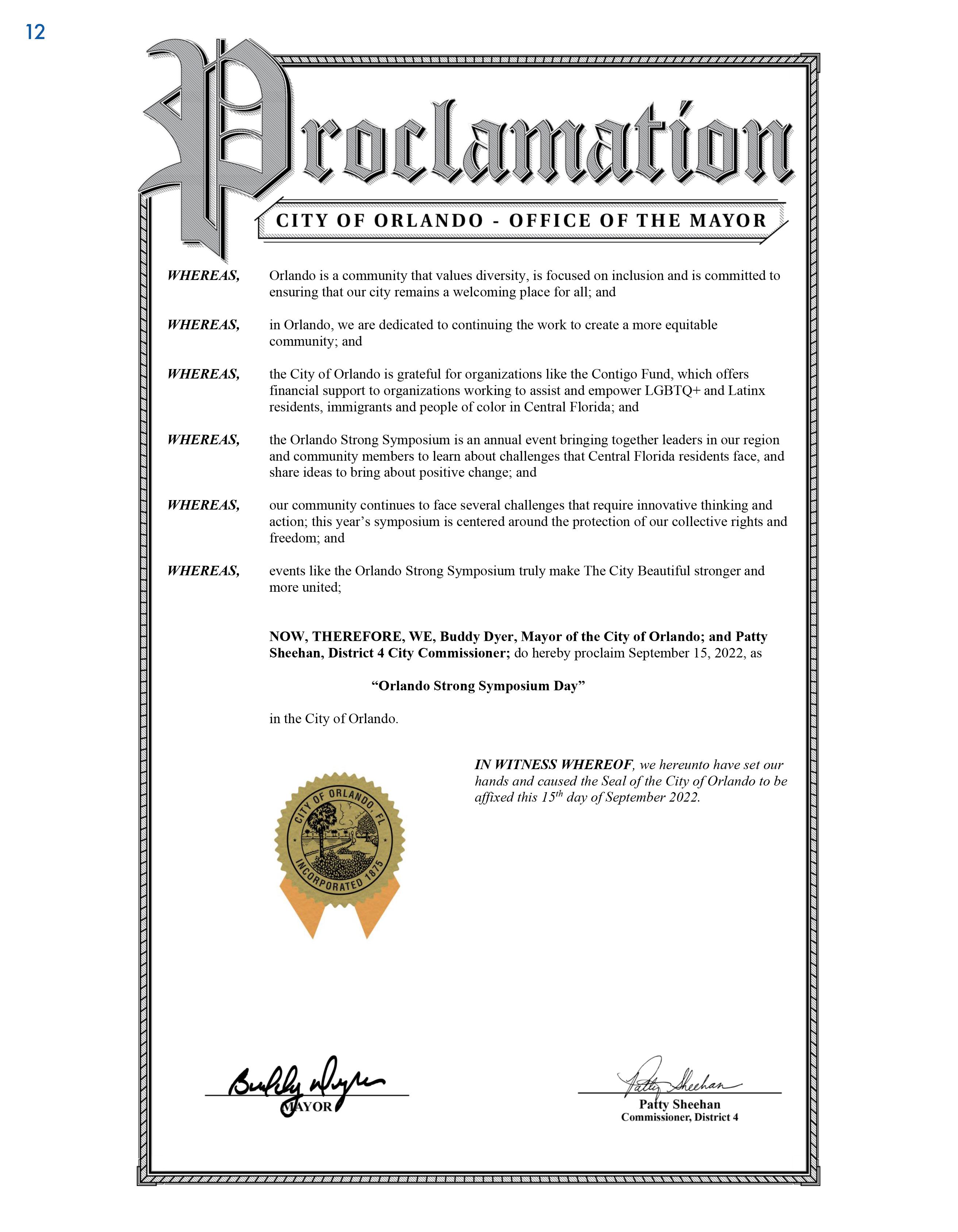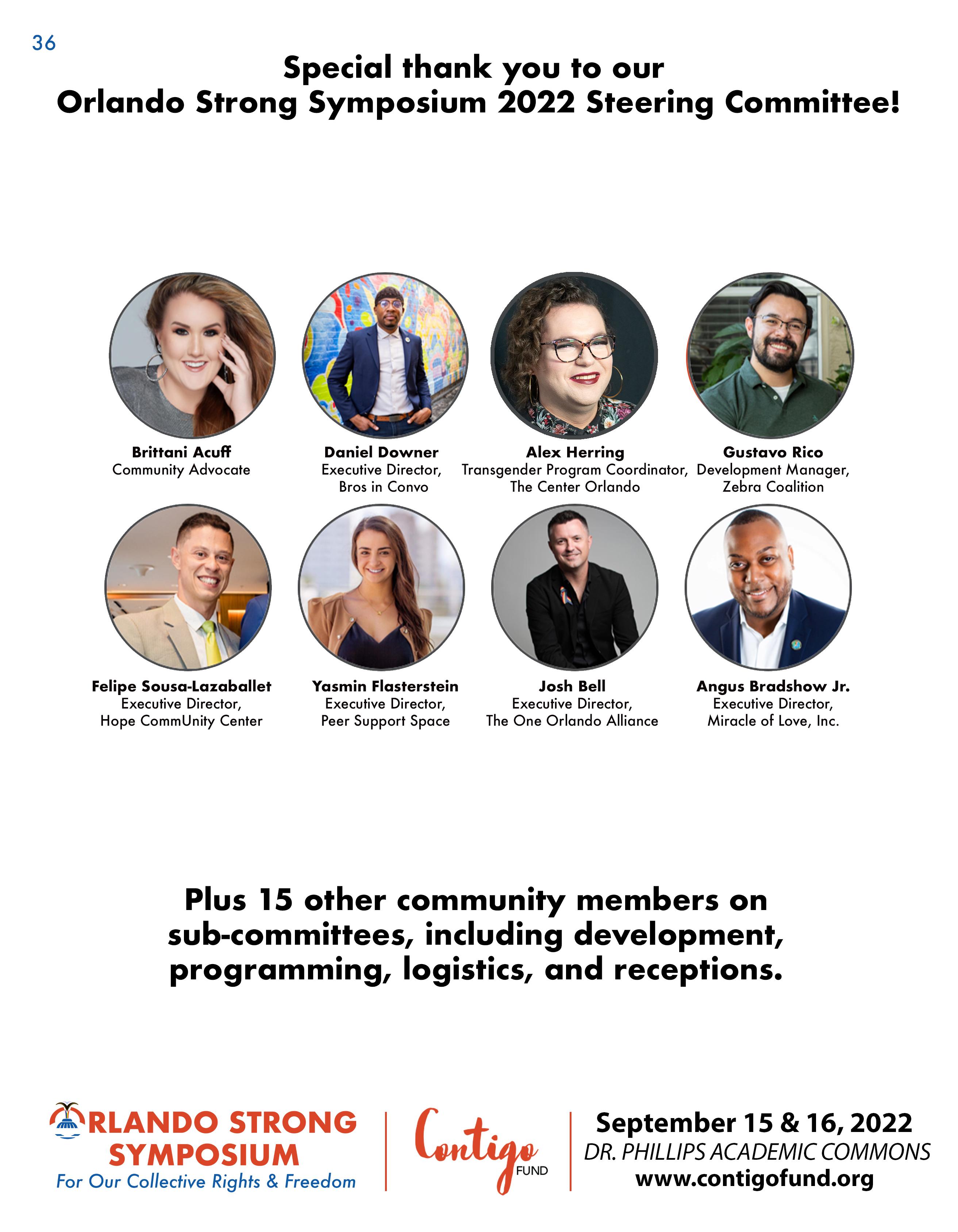 The Orlando Strong Symposium is an annual event that brings together leaders in local and state government and the non-profit, public, and private sectors of Central Florida. This year, we will host a hybrid symposium with panels from Sept 15 through Sept 16. The Symposium gives community members unparalleled access to these decision-makers and is a catalyst for change in the region. This year, the Orlando Strong Symposium looks at collective liberation with freedom for all. If you or your organization would like to help create the most impactful event of the year.
