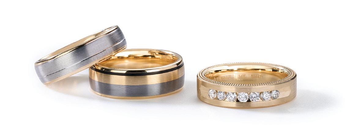 We offer a diverse selection of men’s wedding bands, from timeless classics to bold, distinctive designs.