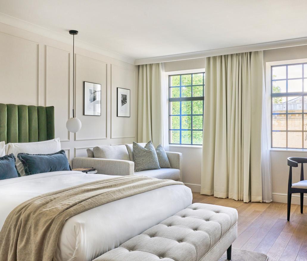The 26 thoughtfully designed bedrooms and suites feature hand-finished plaster, Cotswold stone, and tactile details like