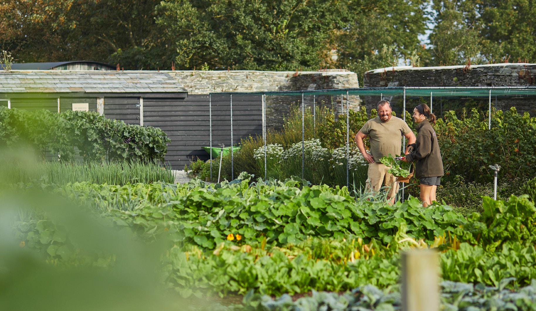 Pictured above and opposite: From plot to plate, the abundant kitchen garden at THE PIG at Harlyn Bay provides the fresh, seasonal ingredients that inspire the hotel's renowned menus. Located just behind the golden sands of Harlyn Bay, THE PIG hotel offers a luxurious coastal retreat with a cosy lounge and rustic, candlelit restaurant.