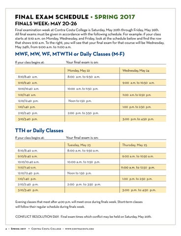 Final examination week at Contra Costa College is Saturday, May 20th through Friday, May 26th. All final exams must be given in accordance with the following schedule. For example: if your class starts at 9:10 a.m. on Monday, Wednesday, and Friday, look at the schedule below and find the row that shows 9:10 a.m. To the right, you will see that your final exam for that course will be Wednesday, May 24th, from 9:00 a.m. to 11:00 a.m.