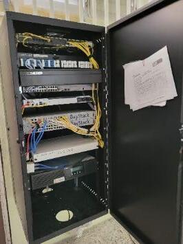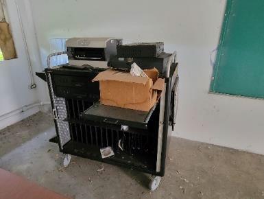 5) Se observaron equipos y materiales de instrucción, gabinetes para servidor de las redes, acondicionadores, de aire, monitores, computadoras portátiles y su estación, televisores, relojes ponchadores, extintores, escritorios, sillas, pupitres, archivos, y equipo de comedores escolares (neveras, mesas, fregadero, bandejas, carro de bandejas y envases de alimentos), resmas de papel tamaño carta y legal, y tintas para impresoras. [Anejo 2]
