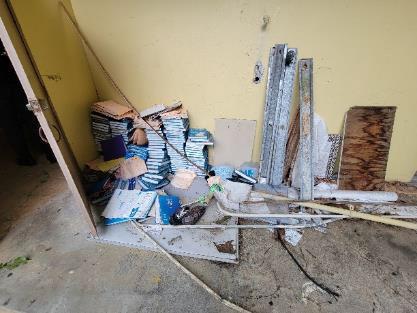 2) En dos escuelas se encontraron animales. En una escuela de estas, encontramos 14 caballos y los salones se utilizan como establos. También había madera, paneles de zinc, tierra, y envases para alimento y agua. [Anejo 1]