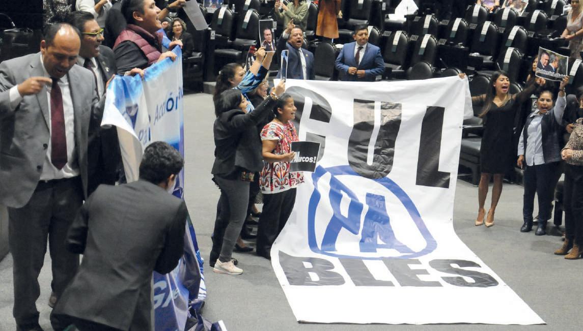 Durante la sesión de ayer en la Cámara de Diputados se vivió entre los grupos afines a la 4T y la oposición de PAN, PRI y PRD una “guerra de pancartas” por el caso de Genaro García Luna, secretario de Seguridad del entonces presidente panista Felipe Calderón y quien fue hallado por EU culpable, entre otros delitos, de tener nexos con el crimen organizado. Foto: Cuartoscuro Pág. 4