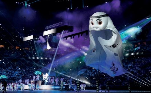 Con una gran mancha amarilla en uno de los fondos en unas gradas mayoritariamente blancas y negras, los colores de la vestimenta tradicio nal de los cataríes, el 'dishdasha' para ellos y el 'abaya' para ellas, sin que hubiese zonas reservadas por sexos, la ceremonia continuó con un ho menaje a los mundiales anteriores, con las mascotas de cada una de las ediciones pasadas.