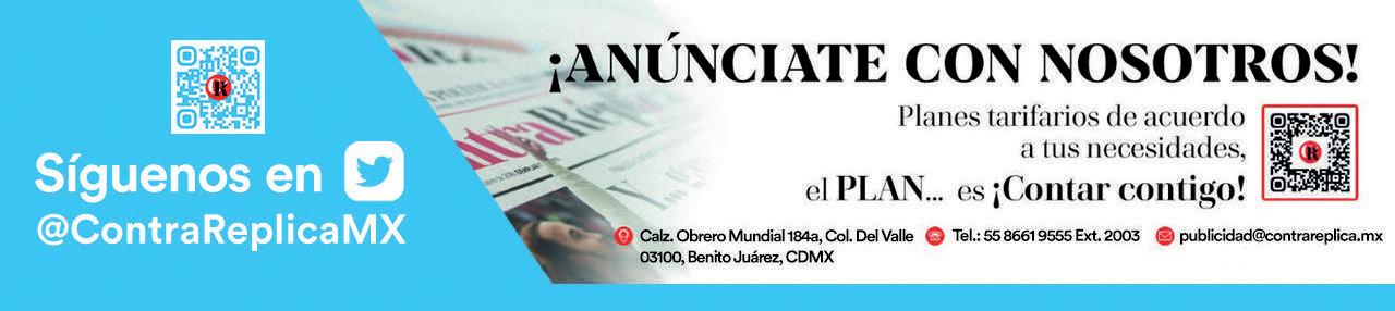 Correo:nación@contrareplica mx Editor responsable: Francisco Santiago G. Permisos: Número de Certificado de Reserva otorgado por el Instituto Nacional del Derecho de Autor: 04-2018-100314550100-101. Certificado de licitud de título y contenido 17407. Impreso en: Compañía Impresora El Universal S.A.de C.V. Allende 176 Colonia Guerrer o teléfono 51170190. Y distribuido por El Economista, Grupo Editorial S.A.de C.V. Santander No. 25