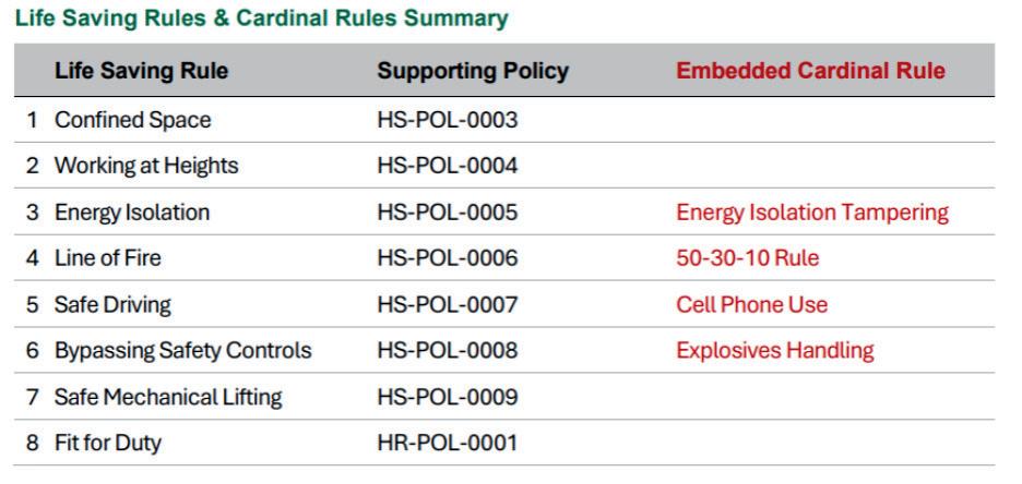 Together, the Life Saving Rules and Cardinal Rules form a unified framework that: Identifies the highest-risk work activities. Establishes clear, enforceable standards for safe performance. Differentiates between violations that may be addressed through corrective action and those that are strictly intolerable due to the significant risks involved.