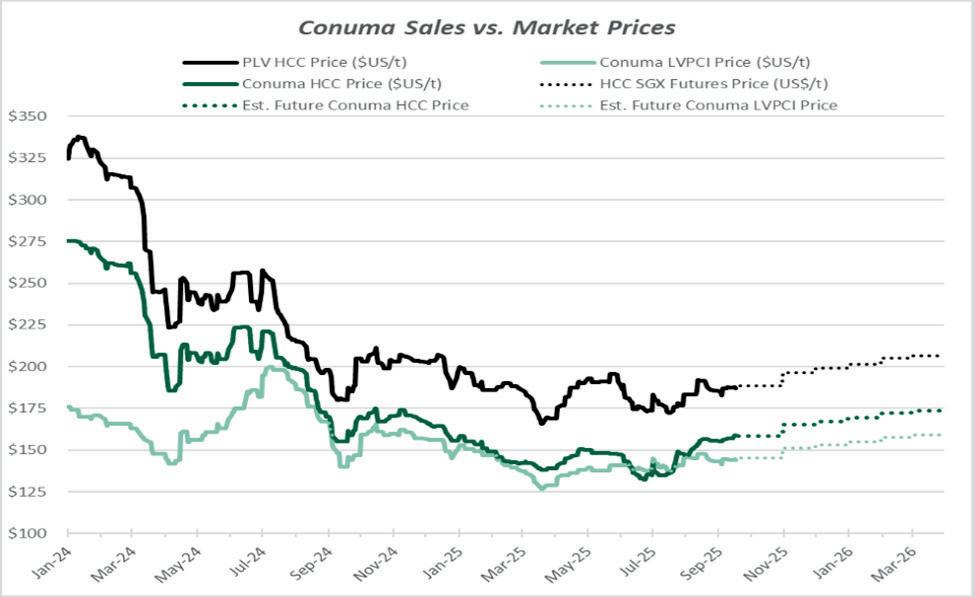Conuma’s HCC typically prices around 88% of the very highest quality global premium benchmark price for steelmaking coals (Premium Low Vol HCC or PLV HCC), reported by Platts on a daily basis. The exact price Conuma receives for its HCC is a function of the comparative quality of our product to the quality of the PLV HCC benchmark price which is representative of the highest observable grades of steelmaking coals available on markets. Typically, the higher the carbon content in a steelmaking coal, the higher its price will be, as its value in making steel is derived from carbon. For the most part, coal qualities are geologically inherent and cannot be altered. Conuma’s HCC is considered a Premium Mid-Vol HCC, well known globally and sought by many steel producers. The Conuma sales team consistently pushes markets to accept higher pricing and where demand exceeds supply, are often able to raise prices for our coals.