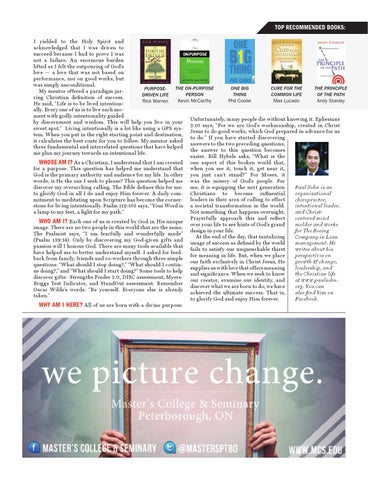 Top Recommended Books: I yielded to the Holy Spirit and acknowledged that I was driven to succeed because I had to prove I was not a failure. An enormous burden lifted as I felt the outpouring of God’s love — a love that was not based on performance, nor on good works, but was simply unconditional. The On-Purpose One Big Cure for the The Principle PurposeMy mentor offered a paradigm-jarPerson Thing Common Life of the Path Driven Life ring Christian definition of success. Kevin McCarthy Phil Cooke Max Lucado Andy Stanley Rick Warren He said, “Life is to be lived intentionally. Every one of us is to live each moment with godly intentionality guided Unfortunately, many people die without knowing it. Ephesians by discernment and wisdom. This will help you live in your 2:10 says, “For we are God's workmanship, created in Christ sweet spot.” Living intentionally is a lot like using a GPS sysJesus to do good works, which God prepared in advance for us tem. When you put in the right starting point and destination, to do.” If you have started discovering it calculates the best route for you to follow. My mentor asked answers to the two preceding questions, three fundamental and interrelated questions that have helped the answer to this question becomes me plan my journey towards an intentional life. easier. Bill Hybels asks, “What is the Whose Am I? As a Christian, I understand that I am created one aspect of this broken world that, for a purpose. This question has helped me understand that when you see it, touch it, get near it, God is the primary authority and audience for my life. In other you just can’t stand?” For Moses, it words, is He the one I seek to please? This question helped me was the misery of God’s people. For discover my overarching calling. The Bible defines this for me: me, it is equipping the next generation Paul Sohn is an to glorify God in all I do and enjoy Him forever. A daily com- Christians to become influential organizational mitment to meditating upon Scripture has become the corner- leaders in their area of calling to effect chiropractor, stone for living intentionally. Psalm 119:105 says, “Your Word is a societal transformation in the world. intentional leader, Not something that happens overnight. a lamp to my feet, a light for my path.” and ChristPrayerfully approach this and reflect centered mind Who Am I? Each one of us is created by God in His unique over your life to see hints of God’s grand molder and works image. There are no two people in this world that are the same. design in your life. for The Boeing The Psalmist says, “I am fearfully and wonderfully made” At the end of the day, that tantalizing Company in Lean (Psalm 139:14). Only by discovering my God-given gifts and image of success as defined by the world management. He passion will I honour God. There are many tools available that fails to satisfy our unquenchable thirst writes about his have helped me to better understand myself. I asked for feedfor meaning in life. But, when we place perspectives on back from family, friends and co-workers through three simple our faith exclusively in Christ Jesus, He growth & change, questions: “What should I stop doing?,” “What should I continsupplies us with love that offers meaning leadership, and ue doing?,” and “What should I start doing?” Some tools to help and significance. When we seek to know the Christian life discover gifts: Strengths Finder 2.0, DISC assessment, Myersour creator, examine our identity, and at www.paulsohn. Briggs Test Indicator, and StandOut assessment. Remember discover what we are born to do, we have org. You can Oscar Wilde’s words: “Be yourself. Everyone else is already achieved the ultimate success. That is, also find him on taken.” to glorify God and enjoy Him forever. Facebook. Why Am I Here? All of us are born with a divine purpose.