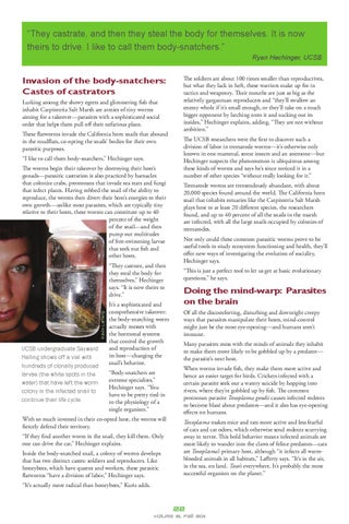 Invasion of the body-snatchers: Castes of castrators Lurking among the showy egrets and glimmering fish that inhabit Carpinteria Salt Marsh are armies of tiny worms aiming for a takeover—parasites with a sophisticated social order that helps them pull off their nefarious plans. These flatworms invade the California horn snails that abound in the mudflats, co-opting the snails’ bodies for their own parasitic purposes. “I like to call them body-snatchers,” Hechinger says. The worms begin their takeover by destroying their host’s gonads—parasitic castration is also practiced by barnacles that colonize crabs, protozoans that invade sea stars and fungi that infect plants. Having robbed the snail of the ability to reproduce, the worms then divert their host’s energies to their own growth—unlike most parasites, which are typically tiny relative to their hosts, these worms can constitute up to 40 percent of the weight of the snail—and then pump out multitudes of free-swimming larvae that seek out fish and other hosts.