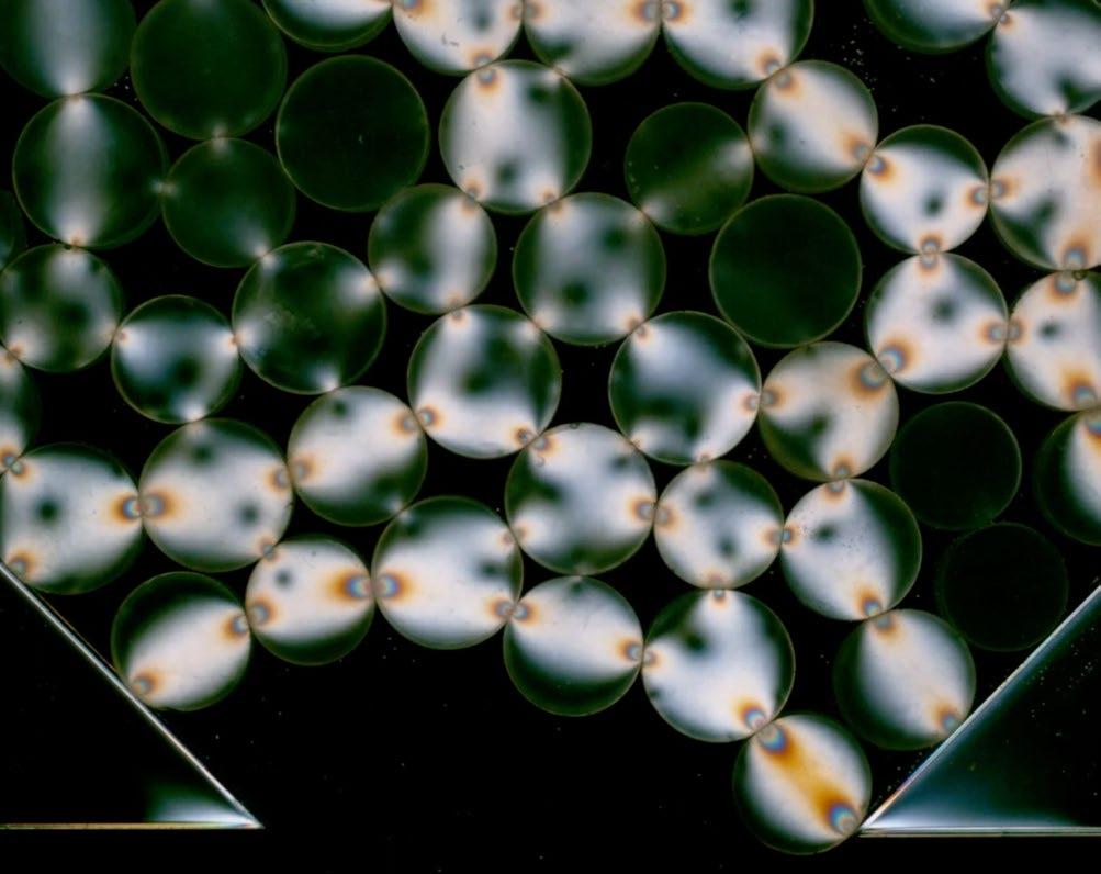 Polyurethane discs viewed through circular polarizers while flowing toward a constriction (as in a hopper) reveal patterns of light indicating the magnitude and direction of pressure. Eventually, a stable bridge clog forms at the opening.