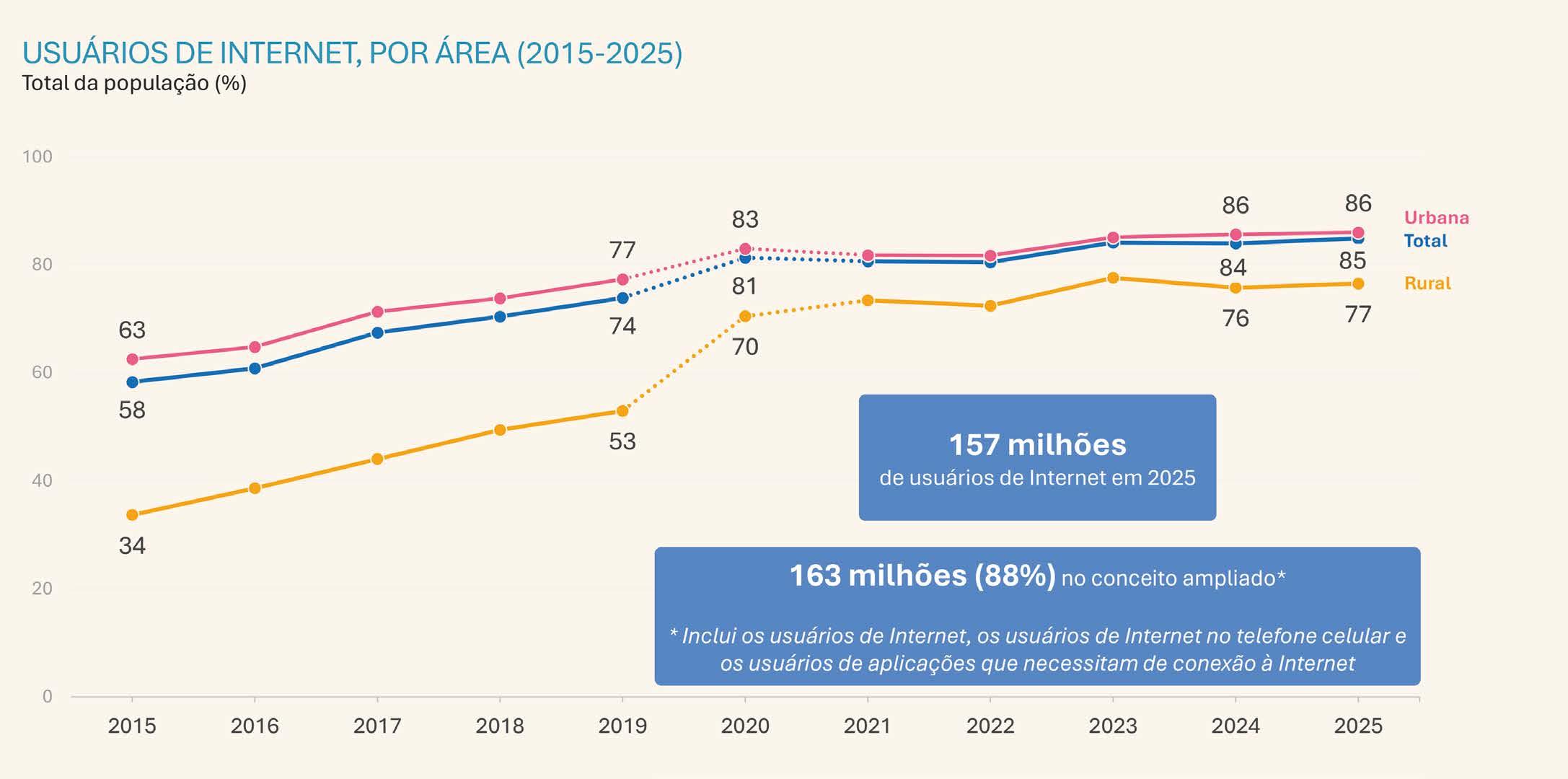De acordo com a pesquisa, 86% da população urbana e 77% da rural é usuária da internet, totalizando 157 milhões de usuários de internet em 2025. Mas incluindo os usuários de internet no telefone celular e aqueles de aplicações que necessitam de conexão à internet, o número chega a 163 milhões (88%) no conceito ampliado.