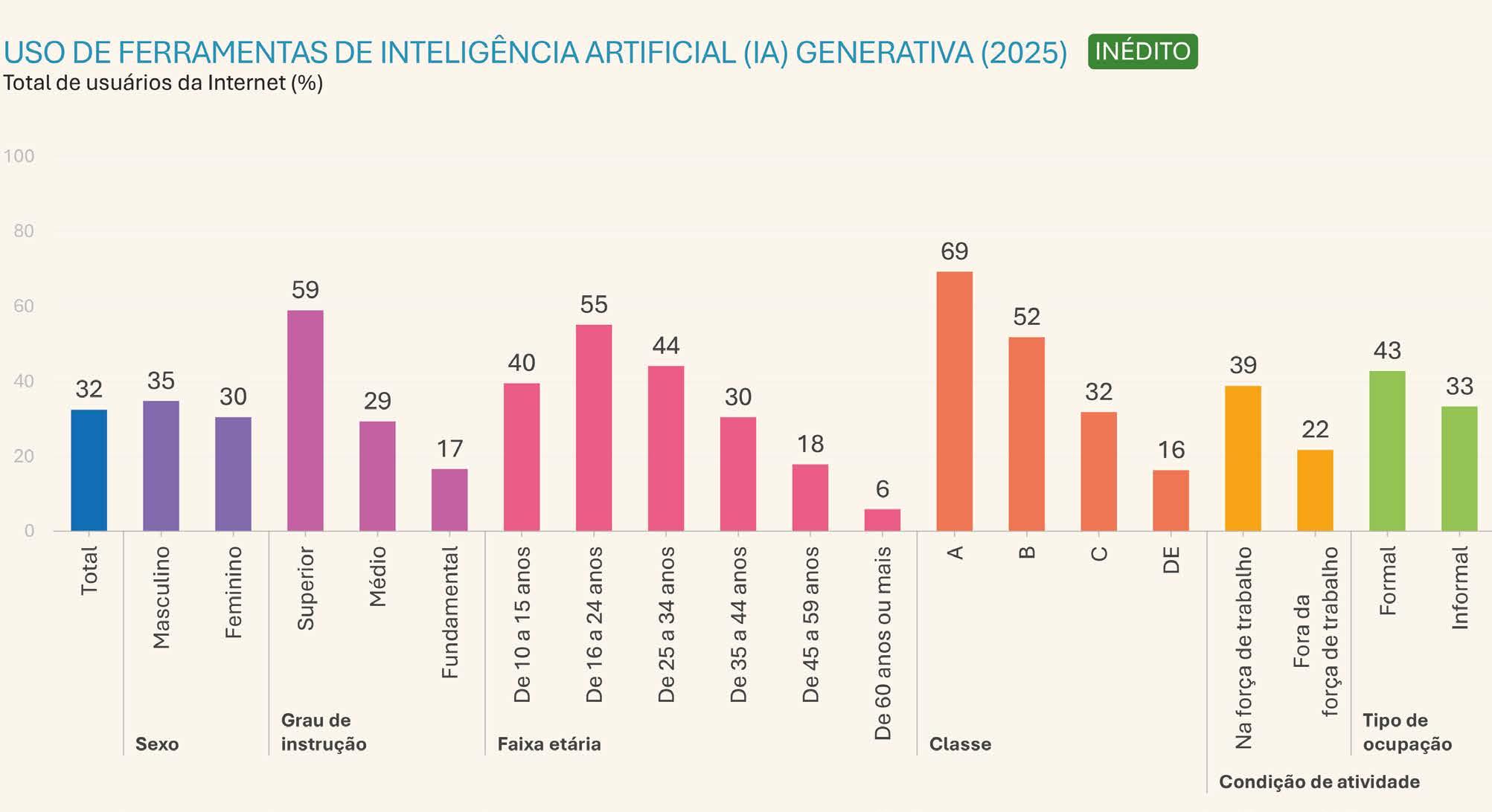O número é alto: 32% dos indivíduos que acessam a internet já usaram a inteligência artificial generativa (IAG), o que equivale, em números absolutos, a cerca de 50 milhões de pessoas com dez anos ou mais. A predominância de usuários de IAG está na classe A (69%) e com ensino superior completo, caindo para 16% nas classes D e E.