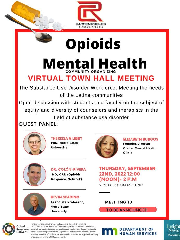 Me VIRTUAL The Substance U o Open discussion equity and dive fiel ELIZABETH BURGOS Founder/Director Crecer Mental Health Clinic KEVIN SPADING Associate Professor, Metro State University THERISSA A LIBBY PhD, Metro State University MEETTING ID VIRTUAL ZOOM MEETING THURSDAY, SEPTEMBER 22ND, 2022 12:00 (NOON)- 2 P.M DR. COLÓN-RIVERA MD, ORN (Opioids Response Network) TO BE ANNOUNCED GUEST PANEL: