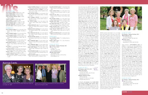 Susan BECKHAM Zurenda ’77 on the death of her father, Henry Gooch Beckham, Jr., December 13, 2009 Susan CAUBLE Brown ’77 on the death of her father, Dr. Herman Woodrow Cauble, Sr., April 25, 2010 Susan MCCALL Britt ’77 on the death of her mother, Carolyn Elizabeth Heriot McCall, May 6, 2010 Mary PEARCE Wilson ’77 on the death of her father, Phillip Edwards Pearce, October 22, 2009 Sheridan SIMS Mann ’77 on the death of her father, Henry R. Sims, September 19, 2009 Kay FERGUSON Theis ’78 on the death of her sister, Lisa Ferguson Arrieta, February 1, 2010 Jeanne JACKSON Mize ’79 on the death of her father, Nelson Jackson II, February 1, 2010 Susan “Woozie” JONES Dell ’79 on the death of her husband, Allan Cooper Dell, Jr., July 31, 2009 Margaret PLASTER Stovall ’79 on the death of her father Harold Edwin Plaster, Sr., January 2, 2010