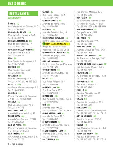 EAT & DRINK RESTAURANTES restaurants À PARTE 6L Av. Defensores de Chaves, 14 C Tel. 21 354 3068 ADEGA DA BAIRRADA 10A Rua Reinaldo Ferreira, 14 A Tel. 21 848 2774 ADEGA DA TIA MATILDE 2G Rua da Beneficência, 77 Tel. 21 797 2172 ADEGA REGIONAL DO MINHO 9F Rua Bulhão Pato, 12 B Tel. 21 848 0861 ALGA 8F Rua Conde de Sabugosa, 3 A Tel. 21 849 6503 ANTÓNIO 4M Rua Tomás Ribeiro, 63 Tel. 21 353 8780 APEADEIRO 6G Rua de Entrecampos, 1 D Tel. 21 797 0724 / 96 563 2600 AREAL, O 10H Av. Padre Manuel Nóbrega, 9 A Tel. 21 840 2036 AREEIRO 3 10I Praça Francisco Sá Carneiro, 3 A-B · Tel. 21 800 2381 ARPÃO, O 6L Rua Dona Estefânia, 92 B Tel. 21 353 6772 BOULEVARD CAFÉ 6L Avenida Praia da Vitória, 35 BUONA BOCCA 4H Avenida 5 de Outubro, 170 B Tel. 21 405 6552 CAFÉ DA PRAÇA 10i Praça Francisco Sá Carneiro, 4 C · Tel. 21 848 7262 CAFÉ IMPÉRIO 9K Av. Almirante Reis, 205 A-B-C Tel. 21 847 3170 8 · EAT & DRINK