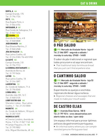 EAT & DRINK HORTA, A 4A Campo Grande, 175 Tel. 21 796 1724 IKO’S 10L Rua Ângela Pinto, 4 Tel. 21 846 4154 IMPERADOR, O 8F Rua Conde de Sabugosa, 5 A Tel. 21 847 1676 22 ISAURA 10I Avenida de Paris, 4 B Tel. 21 848 0838 JOÃO BRANDÃO 8H Rua Oliveira Martins, 2 Tel. 21 840 4968 JÓIA DO PALÁCIO 3L Rua Latino Coelho, 65 Tel. 21 314 5183 / 96 403 5703 LA CAFFÉ 5D Campo Grande, 3 B Tel. 21 796 7713 LA GONDOLA RESTAURANTE 2i Avenida de Berna, 64 Tel. 21 797 0426 LATINO 3L Rua Latino Coelho, 18 Tel. 21 314 1897 LAURENTINA 3J Av. Conde de Valbom, 71 A Tel. 21 796 0260 LISBOA GRILL 9H Avenida João XXI, 16 C Tel. 21 848 3135 LOBBY BISTRO-BAR 4M Sheraton Lisboa · Rua Latino Coelho, 1 · Tel. 21 312 0000 MAGNETIC 4K Av. Conde de Valbom, 18 loja A Tel. 21 357 1519 MAGNOLIA CAFFÉ • Cinema Londres, Avenida de Roma, 7 A Tel. 21 847 1163 8 H • Campo Pequeno, 2 A 5G Tel. 21 795 9852 • Av. Miguel Bombarda, 48 4 J