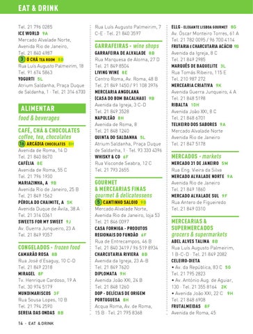 16 ARCÁDIA CHOCOLATES 8H Avenida de Roma, 14 D Tel. 21 840 8670 CAFÉLIA 8E Avenida de Roma, 55 C Tel. 21 796 1930 MARIAZINHA, A 9B Avenida Rio de Janeiro, 25 B Tel. 21 849 1562 PÉROLA DO CHAIMITE, A 5K Avenida Duque de Ávila, 38 A Tel. 21 314 0361 SWEETS FOR MY SWEET 9J Av. Guerra Junqueiro, 23 A Tel. 21 849 9357