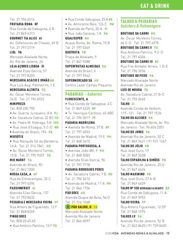 EAT & DRINK Tel. 21 796 4516 FRUTARIA ROMA 8F Rua Conde de Sabugosa, 4 B Tel. 21 849 6313 GOURMET TIA ALICE 6I Av. Defensores de Chaves, 69 B Tel. 21 797 2719 LIDL 9A Mercado Alvalade Norte, Av. Rio de Janeiro, 26 LOJA AÇORES LISBOA 5I Avenida Elias Garcia, 57 Tel. 21 797 8203 MERCEARIA ACÁCIO E IRMÃO 8B Rua Luís Aug. Palmeirim, 1 E MERCEARIA ALZIRITA 7G Av. Óscar Monteiro Torres, 34 B · Tel. 21 796 6922 MINIPREÇO Tel. 808 200 795 • Av. Guerra Junqueiro, 8 A 9J • Av. Sacadura Cabral, 22 BC 7G • Av. Padre M. Nóbrega, 5 B 10H • Rua José d’Esaguy, 5 C-D 8 B • Avenida do Brasil, 194 9A MIOSÓTIS • Rua Marquês Sá da Bandeira, 16 A · Tel. 21 314 7841 2K • Av. Óscar Monteiro Torres, 15 B · Tel. 21 795 9357 7G MIX MARKT 7A Avenida do Brasil, 90 Tel. 21 862 1500 NOSSA CASA, A 6F Rua de Entrecampos, 32 C Tel. 21 797 6294 PASSIONFRUIT 4i Avenida Elias Garcia, 137 Tel. 21 792 8432 PEIXARIA E MERCEARIA VIEIRA 9F Rua Antero de Figueiredo, 12 F Tel. 21 848 8269 PINGO DOCE Tel. 808 20 45 45 • Rua António Patrício, 13 F 7D