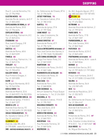 SHOPPING Rua D. Luís de Noronha, 9 A Tel. 21 796 9900 ELECTRO NEVES 9B Avenida Rio de Janeiro, 46 E-F Tel. 21 800 4550 ESPELHADORA DE ROMA, A 8F Avenida de Roma, 35 B Tel. 21 796 4476 ESPELHO VITÓRIA 8B Rua Luís Aug. Palmeirim, 8 C Tel. 21 849 2314 ÉTUDOGIRO 8B Rua José d’Esaguy, 2 B Tel. 21 840 3027 EXÓTICA 8E Avenida de Roma, 48 A Tel. 21 849 5399 FIMIOLA 8B Rua Luís Aug. Palmeirim, 1 A Tel. 21 849 2176 FORLADY 5J Avenida da República, 37 Tel. 21 790 6910 GALLERY HOUSE 4L Rua Pinheiro Chagas, 4 Tel. 21 359 0055 GLOW 4J Av. Miguel Bombarda, 83 D Tel. 93 762 5704 GÓIS & FERRO 9G Avenida de Madrid, 32 A Tel. 21 849 0977 / 96 902 0924 GRANDES ARMAZÉNS IGREJA 8B Avenida da Igreja, 17 A-B-C Tel. 21 849 1277 HOUSE & LIFE 4i Avenida Elias Garcia, 93 Tel. 91 722 2699 / 91 393 5025 IDEIAS FUNDAMENTAIS 7G Av. Sacadura Cabral, 27 B Tel. 91 440 0163 ILLUMINATI 8H Avenida João XXI, 48 A 21 795 8285 · www.illuminati.pt IMO - INSPIRED MEMORABLE OBJECTS 6i