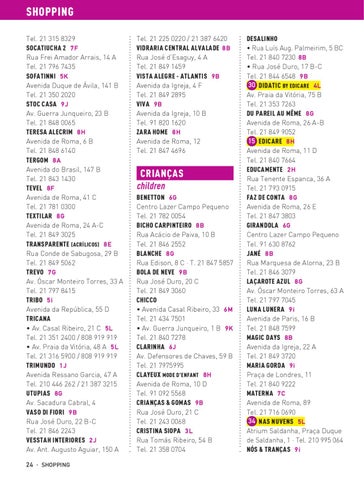 CRIANÇAS children BENETTON 6 G Centro Lazer Campo Pequeno Tel. 21 782 0054 BICHO CARPINTEIRO 8 B Rua Acácio de Paiva, 10 B Tel. 21 846 2552 BLANCHE 8 G Rua Edison, 8 C · T. 21 847 5857 BOLA DE NEVE 9 B Rua José Duro, 20 C Tel. 21 849 3060 CHICCO • Avenida Casal Ribeiro, 33 6 M Tel. 21 434 7501 • Av. Guerra Junqueiro, 1 B 9 K Tel. 21 840 7278 CLARINHA 6 J Av. Defensores de Chaves, 59 B Tel. 21 7975995 CLAYEUX MODE D’ENFANT 8 H Avenida de Roma, 10 D Tel. 91 092 5568 CRIANÇAS & GOMAS 9 B Rua José Duro, 21 C Tel. 21 243 0068 CRISTINA SIOPA 3 L Rua Tomás Ribeiro, 54 B Tel. 21 358 0704