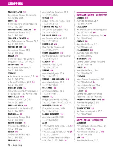 SHOPPING SEASON STATUS 7C Avenida de Roma, 83 cave dta. Tel. 92 662 2785 SEGUE 6G Centro Lazer Campo Pequeno Tel. 21 782 0584 SEMPRE ORIGINAL CORK ART 8 F Avenida de Roma, 44 D Tel. 21 840 4669 SENADOR ALFAIATES 6L Av. Defensores de Chaves, 54 B Tel. 21 797 3665 SENTIDO DA COR 8G Avenida de Roma, 21 D Tel. 21 848 5076 SISLEY 6G Centro de Lazer do Campo Pequeno · Tel. 21 794 1432 SPRINGFIELD 9J Av. Guerra Junqueiro, 5 Tel. 21 848 1684 STEFANEL • Av. Guerra Junqueiro, 7 B 9 J Tel. 21 840 9538 • Av. da República, 45 B 5J Tel. 21 796 9367 STONE BY STONE 5L Atrium Saldanha, Praça Duque de Saldanha · Tel. 96 952 7322 TENDÊNCIAS 10H Avenida João XXI, 8 D-E Tel. 96 393 6685 TERESA SILVEIRA 9B Avenida Rio de Janeiro, 23 Tel. 21 846 1215 TINTIN LOJA 8F Avenida de Roma, 39 A Tel. 21 793 5582 TOMMY HILFIGER 9i Praça de Londres, 9 B Tel. 21 816 0021 TOMSK 8C Avenida de Roma, 76 A Tel. 21 840 8383 TROUSSIER 4J 30 · SHOPPING