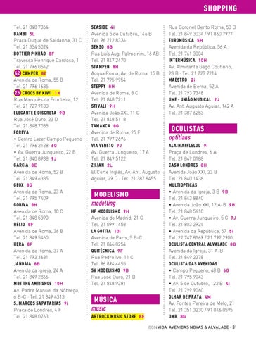 SHOPPING Tel. 21 848 7364 BAMBI 5L Praça Duque de Saldanha, 31 C Tel. 21 354 5024 BOTTIER PINHÃO 8F Travessa Henrique Cardoso, 1 Tel. 21 796 0542 42 CAMPER 8E Avenida de Roma, 55 B Tel. 21 796 1635 26 CROCS BY KIWI 1K Rua Marquês da Fronteira, 12 Tel. 21 727 9130 ELEGANTE E DISCRETA 9B Rua José Duro, 23 D Tel. 21 848 7035 FOREVA • Centro Lazer Campo Pequeno Tel. 21 796 2128 6G • Av. Guerra Junqueiro, 22 B Tel. 21 840 8988 9J GARCIA 8E Avenida de Roma, 52 B Tel. 21 849 6335 GEOX 8G Avenida de Roma, 23 A Tel. 21 795 7409 GODIVA 8H Avenida de Roma, 10 C Tel. 21 848 5390 HÉLIO 8F Avenida de Roma, 36 B Tel. 21 849 5460 HERA 8F Avenida de Roma, 37 A Tel. 21 793 3631 JANDAIA 8B Avenida da Igreja, 24 A Tel. 21 849 2866 MBT THE ANTI SHOE 10H Av. Padre Manuel da Nóbrega, 6 B-C · Tel. 21 849 4313 S. MARCOS SAPATARIAS 9i Praça de Londres, 4 F Tel. 21 848 0763