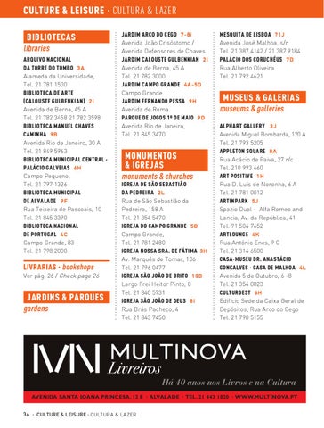 CULTURE & LEISURE · CULTURA & LAZER BIBLIOTECAS libraries ARQUIVO NACIONAL DA TORRE DO TOMBO 3A Alameda da Universidade, Tel. 21 781 1500 BIBLIOTECA DE ARTE (CALOUSTE GULBENKIAN) 2i Avenida de Berna, 45 A Tel. 21 782 3458 21 782 3598 BIBLIOTECA MANUEL CHAVES CAMINHA 9B Avenida Rio de Janeiro, 30 A Tel. 21 849 5963 BIBLIOTECA MUNICIPAL CENTRAL PALÁCIO GALVEIAS 6H Campo Pequeno, Tel. 21 797 1326 BIBLIOTECA MUNICIPAL DE ALVALADE 9F Rua Teixeira de Pascoais, 10 Tel. 21 845 3390 BIBLIOTECA NACIONAL DE PORTUGAL 4C Campo Grande, 83 Tel. 21 798 2000