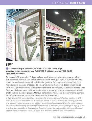 Ao longo de 10 anos a Lev® desenvolveu um tratamento simples, seguro e eficaz que possui mais de 30.000 casos de sucesso em Portugal. Nas 24 clínicas em todo o país o atendimento pessoal, individual e gratuito é assegurado por um nutricionista durante e após o processo de emagrecimento. Sempre a desenvolver novas fórmulas, garantindo uma crescente diversidade e qualidade, as saborosas refeições Gourmet de baixo valor calórico e alto valor proteico, garantem um emagrecimento gratificante e pleno de prazer. Marque consulta na nossa loja e experimente os mais de 100 alimentos de texturas e consistências diferentes. 3 Over the last 10 years, Lev® has developed a simple, safe and effective treatment with over 30.000 satisfied customers in Portugal. In the 24 clinics around the country, our free and tailored customer care is provided by a nutritionist during and after the slimming process. We are constantly developing new formulae to ensure a growing range of high quality and delicious low calorie, high protein Gourmet meals for pleasurable slimming. Book an appointment and sample the 100+ foods with different textures and consistencies.