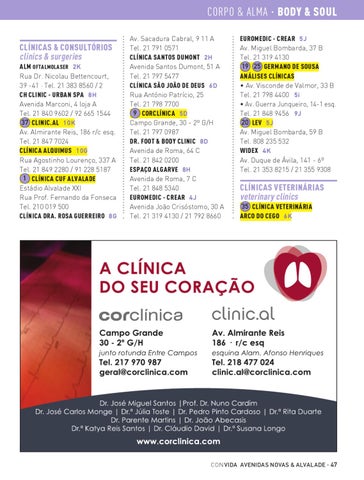 Av. Sacadura Cabral, 9 11 A Tel. 21 791 0571 CLÍNICA SANTOS DUMONT 2 H Avenida Santos Dumont, 51 A Tel. 21 797 5477 CLÍNICA SÃO JOÃO DE DEUS 6 D Rua António Patrício, 25 Tel. 21 798 7700 9 CORCLÍNICA 5 D Campo Grande, 30 - 2º G/H Tel. 21 797 0987 DR. FOOT & BODY CLINIC 8 D Avenida de Roma, 64 C Tel. 21 842 0200 ESPAÇO ALGARVE 8 H Avenida de Roma, 7 C Tel. 21 848 5340 EUROMEDIC - CREAR 4 J Avenida João Crisóstomo, 30 A Tel. 21 319 4130 / 21 792 8660