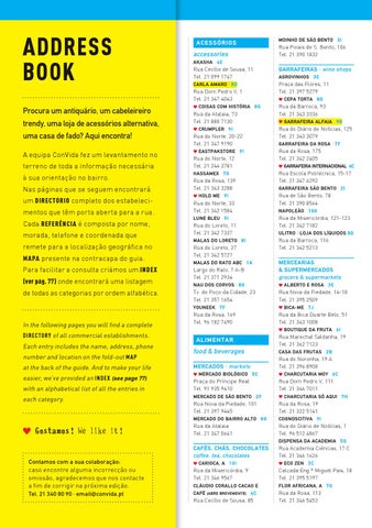 trendy, uma loja de acessórios alternativa, uma casa de fado? Aqui encontra! A equipa ConVida fez um levantamento no terreno de toda a informação necessária à sua orientação no bairro. Nas páginas que se seguem encontrará um directório completo dos estabelecimentos que têm porta aberta para a rua. Cada referência é composta por nome, morada, telefone e coordenada que remete para a localização geográfica no mapa presente na contracapa do guia. Para facilitar a consulta criámos um index (ver pág. 77) onde encontrará uma listagem de todas as categorias por ordem alfabética.